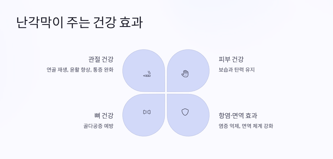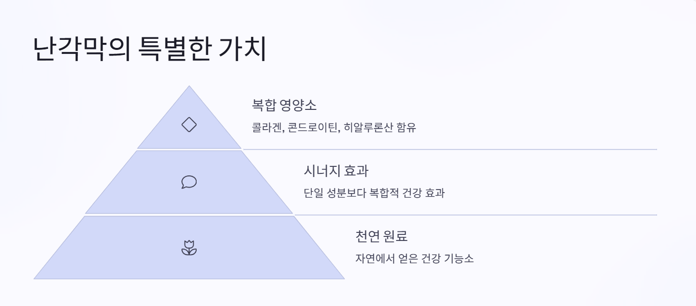 난각막은 콜라겐 외에도 콘드로이틴, 히알루론산 등 복합적인 관절·피부 기능 성분을 함유하고 있어 시너지 효과가 큽니다.