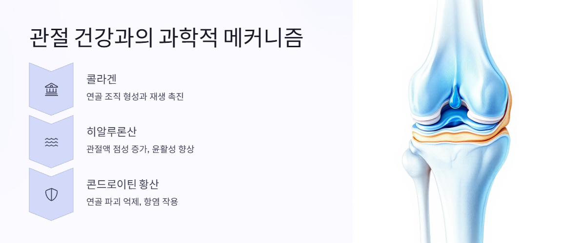 | 콜라겐 | 연골 조직 형성과 재생을 촉진하여 관절 내 구조를 안정화 |