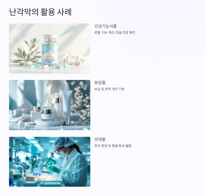 최근 난각막은 건강기능식품, 화장품, 의약품 등 다양한 분야에서 고부가가치 원료로 활용되고 있습니다. 특히 난각막 추출물(NEM, Natural Eggshell Membrane)은 관절 기능 개선과 연골 건강 촉진에 대한 인체적용시험 결과들이 속속 발표되며 기능성 원료로 인정받고 있어요. 또한 화장품에서는 보습 및 탄력 개선 기능을, 의약품에서는 조직 재생 및 항염 특성으로 활용됩니다.