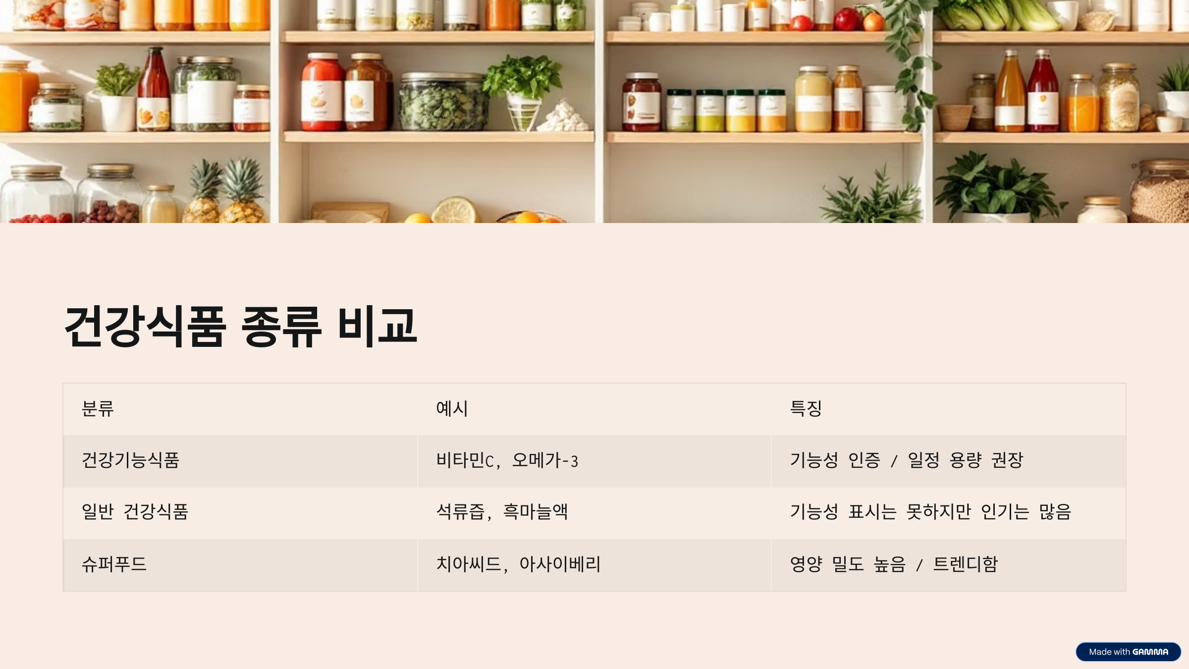 | 슈퍼푸드 | 치아씨드, 아사이베리 | 영양 밀도 높음 / 트렌디함 |