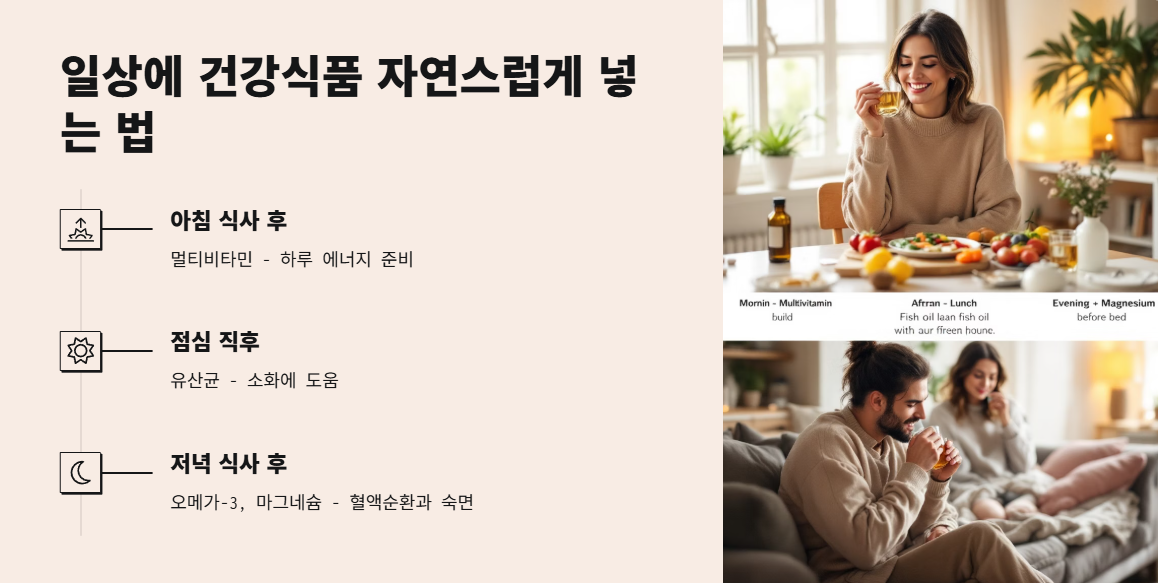 건강식품은 한 번에 몰아서 먹기보다는 일상 속에 자연스럽게 스며들게 하는 게 좋아요. 아래처럼 하루 루틴 안에 녹여보세요.