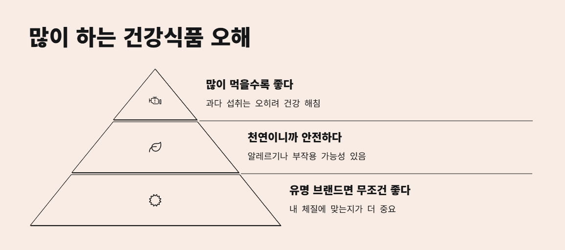 건강식품이 많아지면서 오해도 함께 늘어나고 있어요. 대표적인 오해 중 하나는 ‘많이 먹을수록 좋다’는 생각인데요, 사실은 과다 섭취가 오히려 건강을 해칠 수 있어요. 또 ‘천연이니까 안전하다’는 말도 절대적으로 믿으면 안 됩니다. 알레르기나 부작용이 있을 수 있기 때문이죠. 심지어 유명한 브랜드 제품이라고 무조건 믿기보다는 내게 맞는지 확인하는 게 먼저랍니다.