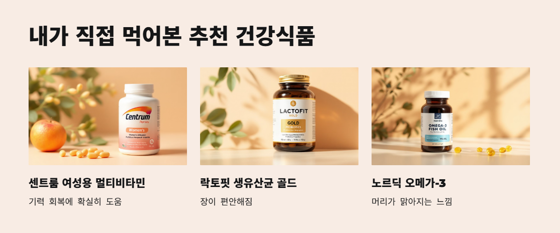 저는 몇 가지 건강식품을 꾸준히 섭취하고 있어요. 직접 먹어보고 괜찮았던 제품들 리스트를 소개할게요.